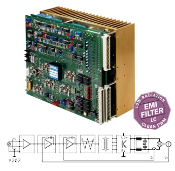 The V207 high-power amplifier series is a universally usable servo amplifier with extensive monitoring which can be specifically configured to customer needs. Clean DC voltage at the output is achieved by L/C low pass filtering in the output stage.